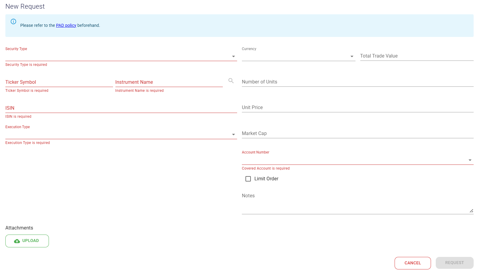 - Symbol: Type part of the symbol or name of the security, click the Spyglass button and Leo will offer some suggestions that match. If the security you’re looking for isn’t already on the list, you can type the symbol yourself. A New Request form will pop up for you to complete. You must fill in all the fields marked with an asterisk (*)