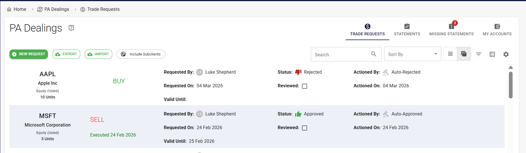 If you are an employee of the firm and registered on Leo, you can use Leo to request permission to make personal account trades. You can view all of the trades you’ve requested. If you’re a Leo user with PA Dealing Approver permissions, you can see everyone else’s requests, as well as your own.